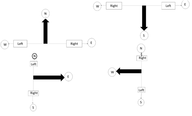 2) Kat walks 4km towards the South. She then turns towards her left and walks 8km more. After that, she turns left again and walks another 8km. Here she meets her friend coming from the opposite direction and they both stop here. Which direction would she be facing?