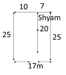 3) Ram and Shyam start walking towards North and cover 20m. Ram turns to his left and Shyam to his right. After some time Ram walks he turned. On the other hand, Shyam walks only 7m. Later Ram turns towards his left and Shyam to his right. Both walk 25m forward. How far is Ram from Shyam now?